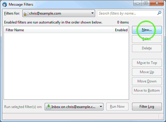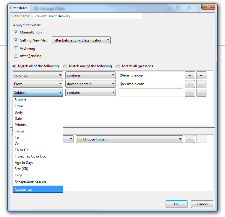 The following guide will create a filtering rule in Thunderbird, placing messages that did not pass through MX Guarddog's network into a folder you specify. This rule works because real email will always pass through MX Guarddog, so only spam that is delivered direct to your server will be filtered.