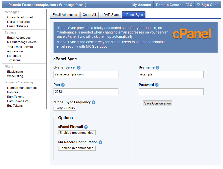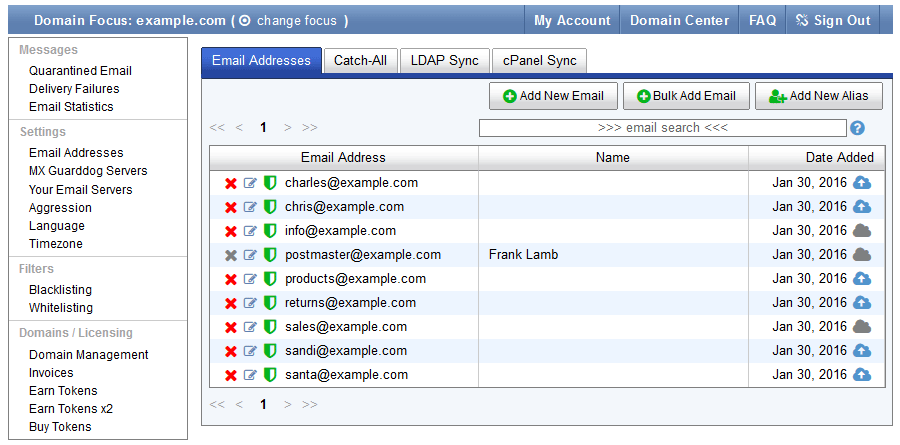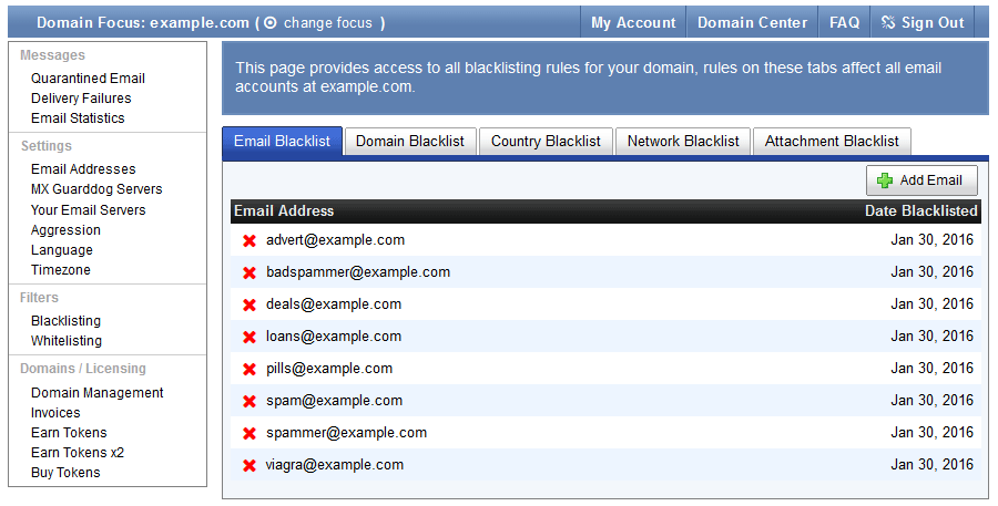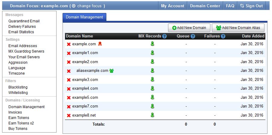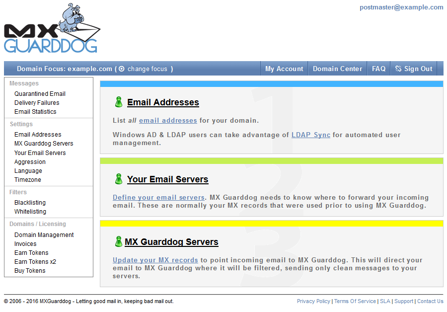 The following are screenshots intended for new users who are curious about the management interface of MX Guarddog from a perspective of a postmaster. Of course you are invited to register your own domain and try the service out for free, there is never a charge for your first month of service and no credit card is required to get started.