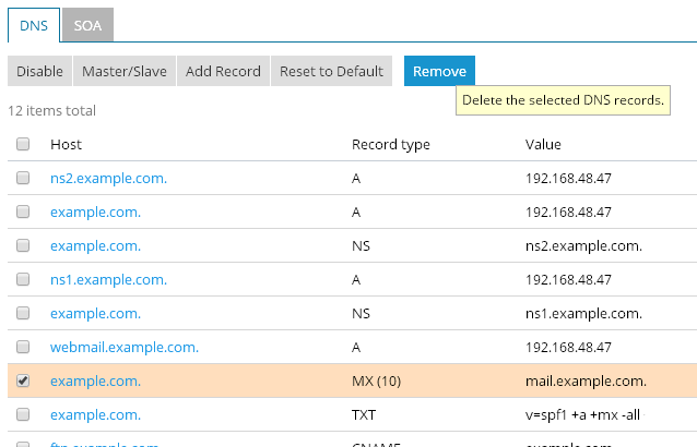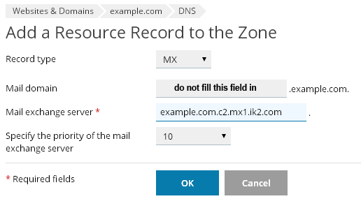Use the Add Record button and add three new MX Records , using the settings in the table below, this will direct your incoming mail to our network of servers. When adding new MX records you must leave the mail domain section blank.