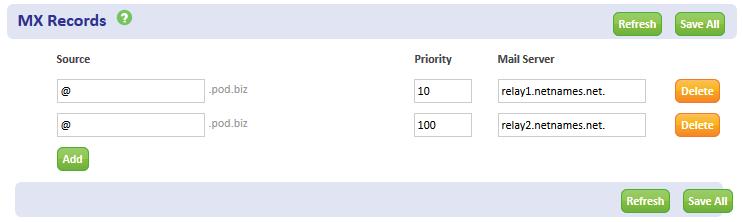 Add three new MX Records, using the settings in the table below. Ensure you place an @ symbol in the source field, and end the mail server entry with a period. These are both requirements of Speednames and your MX records will not work correctly if you leave these two items out. With the three new MX records in place, press Save All to save your changes.