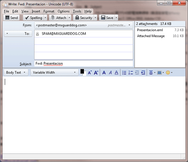 3) You should now have a new message ready to be forwarded with your spam attached. You can drag additional messages from your inbox to the attachment area to send multiple messages at once.