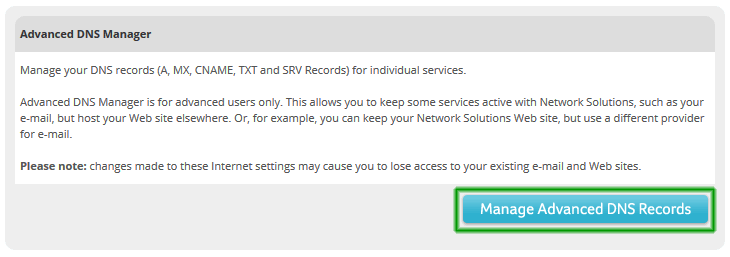 Cliquer sur le bouton Gérer Enregistrements DNS Avancés pour éditer les enregistrements DNS pour votre domaine.
