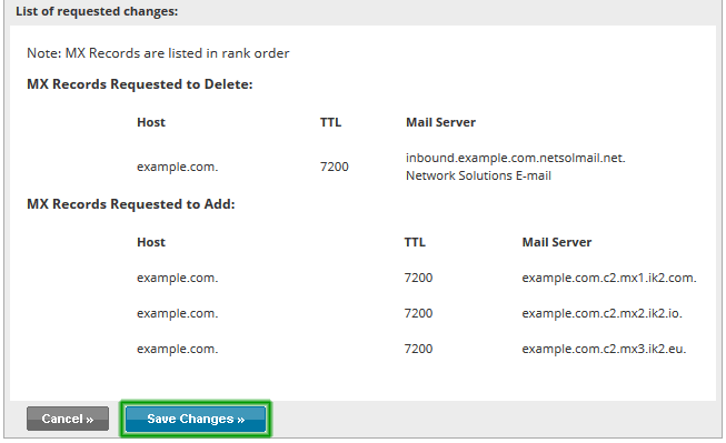 Vérifiez que vos changements semblent corrects, vous devriez avoir trois nouveaux serveurs de messagerie listés. Dans la colonne hôte devrait apparaître le nom du domaine que vous protégez. Cliquez sur Sauvegarder Changements >>> pour appliquer les changements.